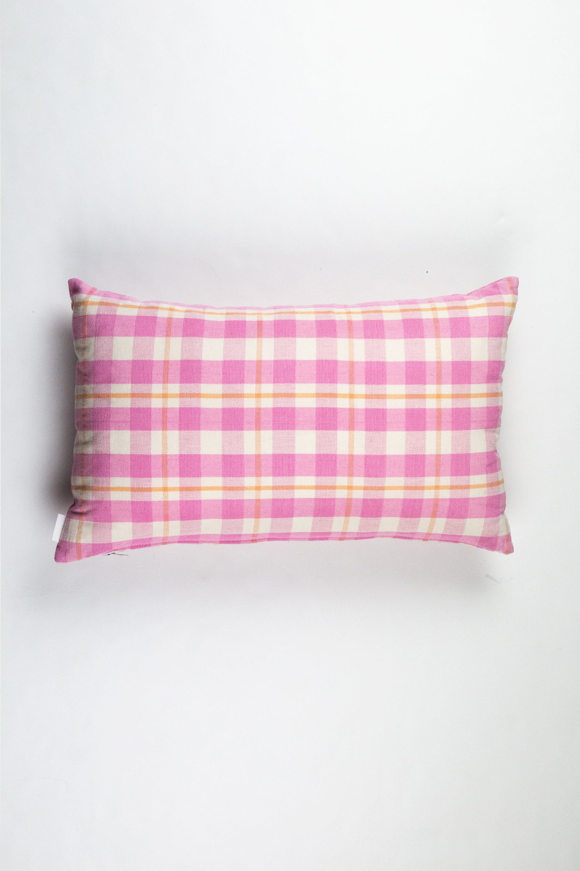 The Archive NY Abigail plaid pillow is the perfect accent to add soft color and texture to any sofa, bedroom or accent chair. Stripes of bubblegum with peach accent are woven together to create this brilliantly colorful piece. Ethically handwoven by artisans in Xela, Guatemala.