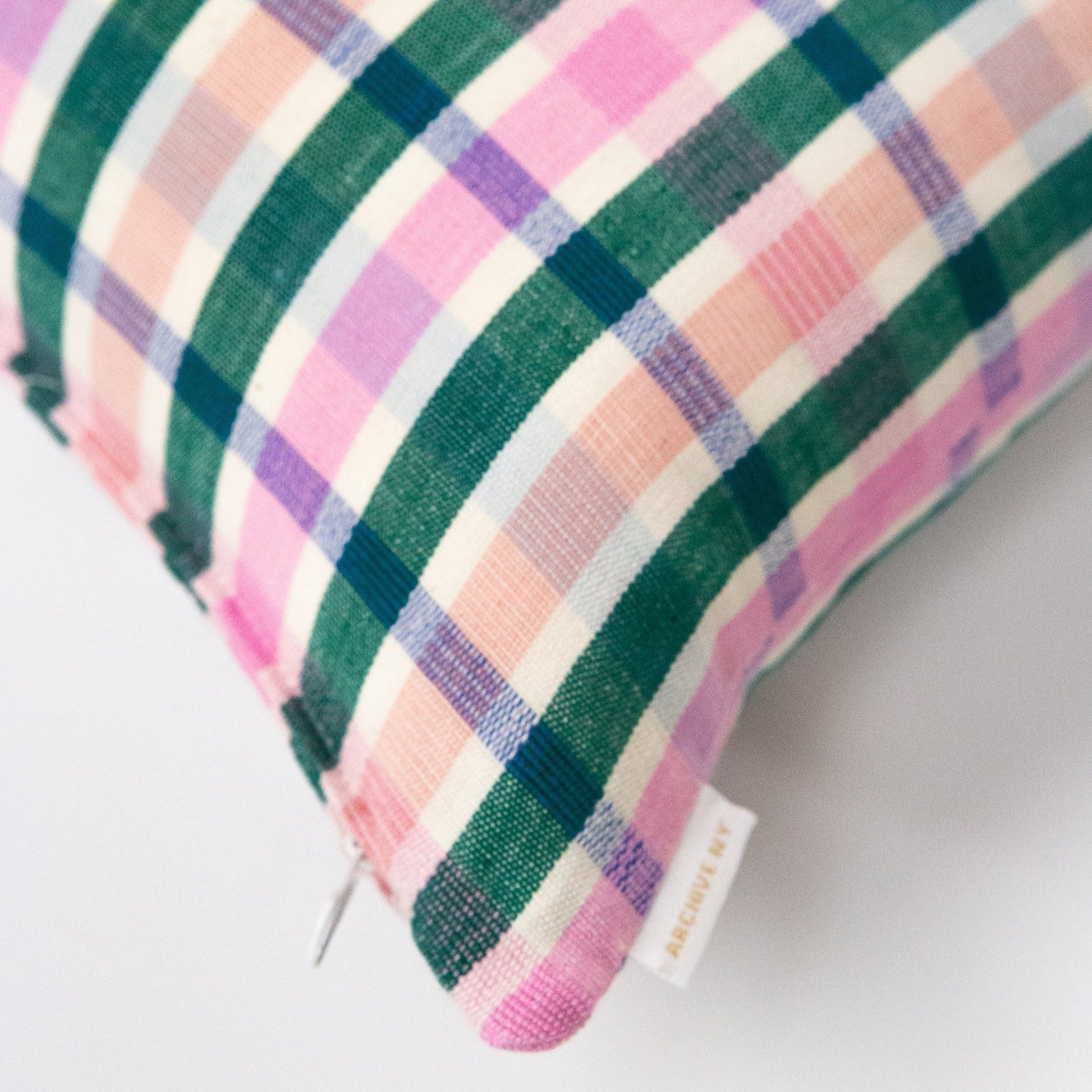 The Lola plaid pillow is the perfect accent to add soft color and texture to any sofa, bedroom or accent chair. Stripes of light pink, peach, emerald and royal blue are woven together to create this brilliantly colorful piece. Ethically handwoven by artisans in Xela, Guatemala.