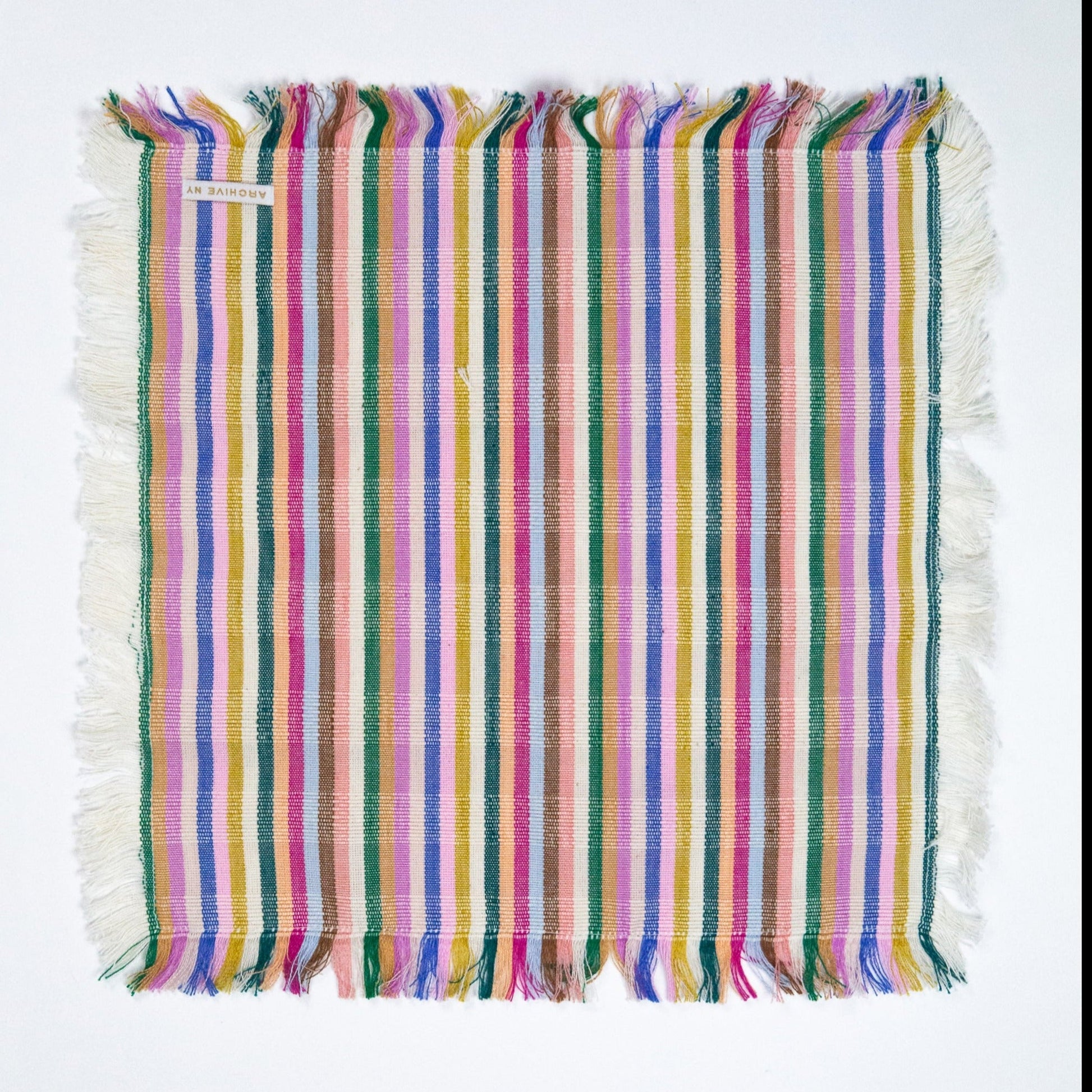 The Valentina multicolor striped party napkin is the perfect rainbow accent to any table setting. The party napkin is smaller in size than our dinner napkin and has a fringe around the edges. Stripes of light pink, ochre, emerald, lilac, royal blue, umber and fuchsia are woven together to create this brilliantly colorful textile. Ethically handwoven by artisans in Xela, Guatemala.