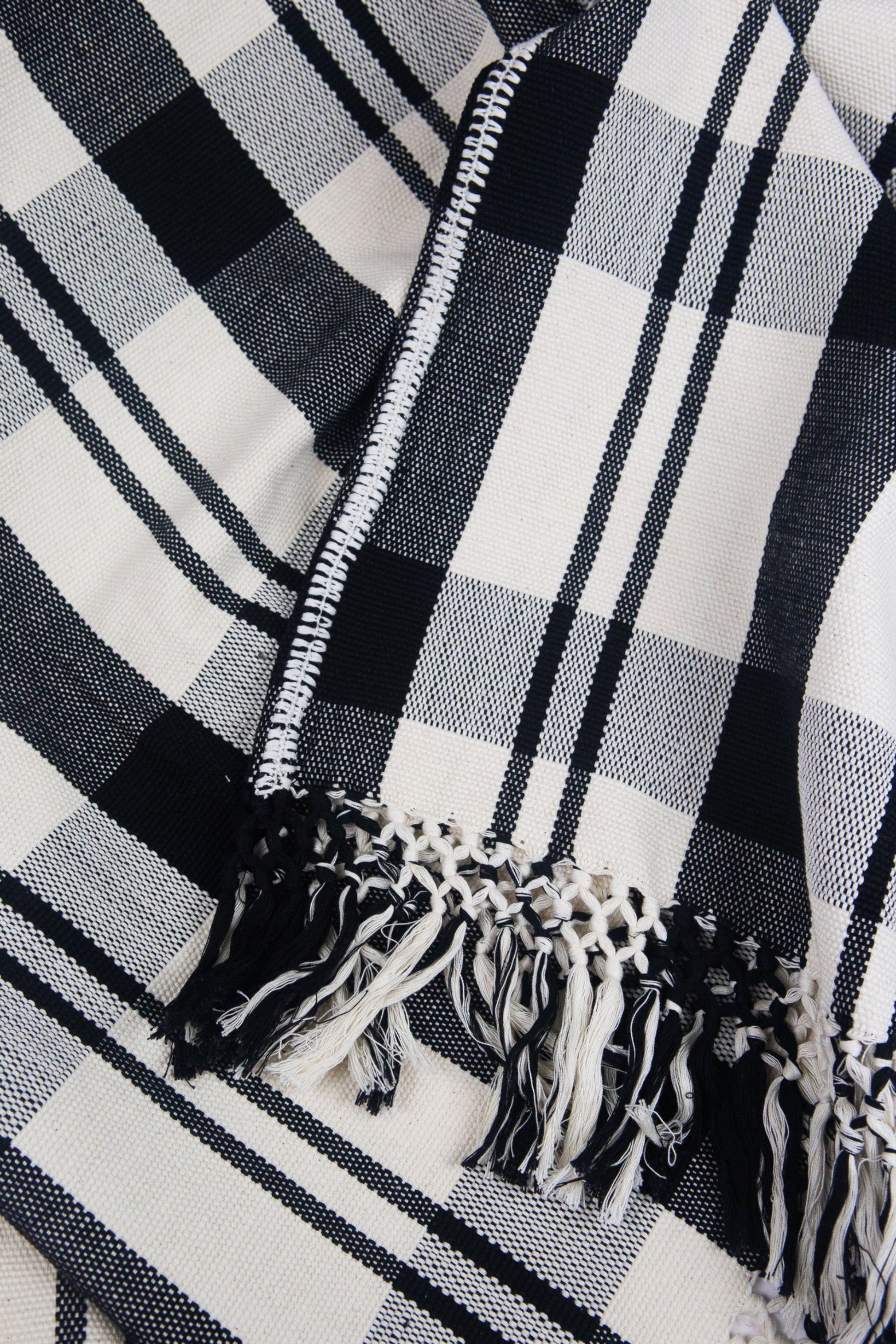 Bold and graphic black and white plaid blanket, using heavy cotton. Perfect for home styling or picnics. Ethically handwoven by artisans in Totonicapan, Guatemala on traditional footlooms. Features 100% natural white cotton, and a hand embroidered randa (panel connecting embroidery).