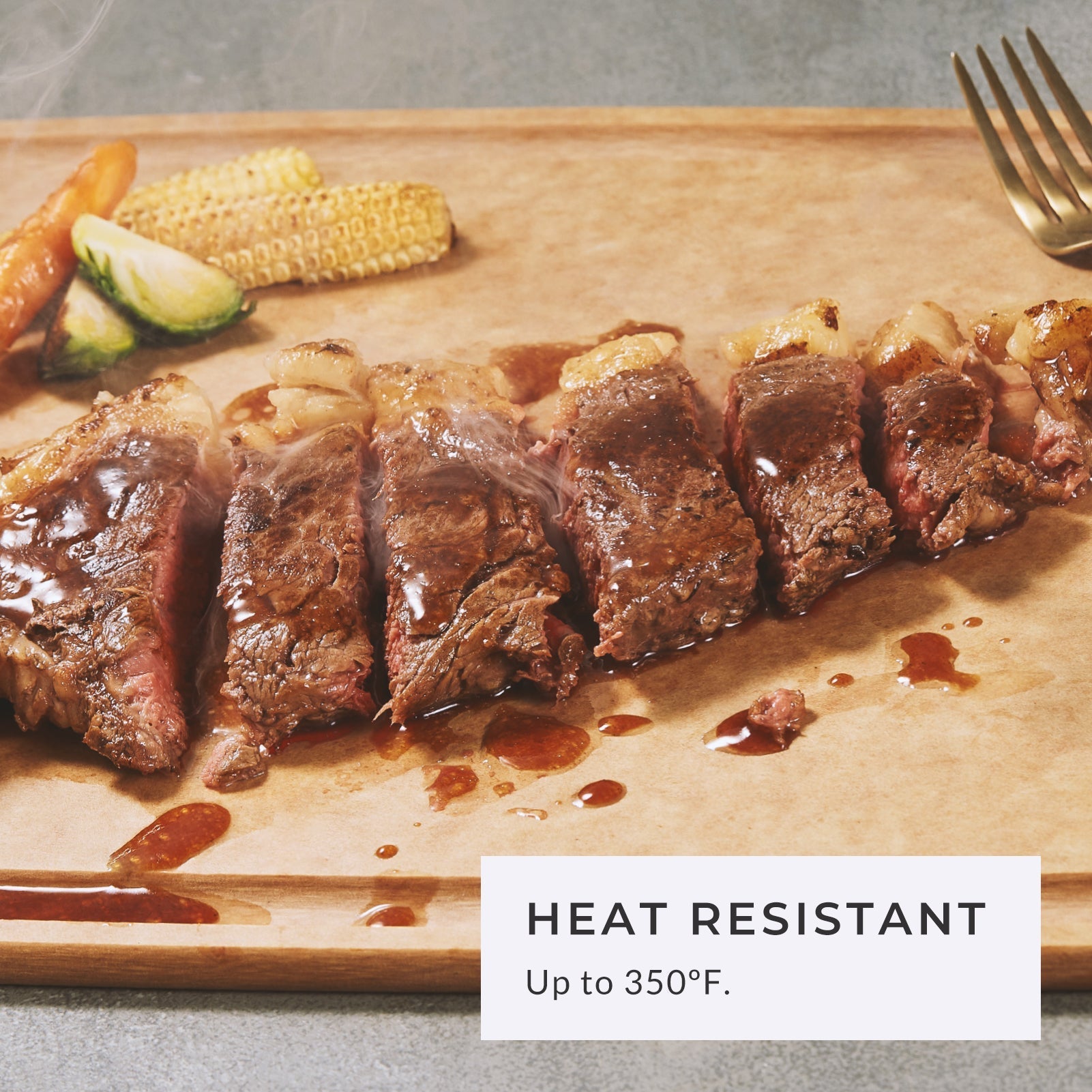 - Made in the USA from high-density pine leaf sustainable material, this fiberwood 10"x 13"x 1/4” inch (24 x 33 x 0.63cm) cutting board is perfect for daily meal preparation; No matter veggies or meat, the reversible design allows you simply flip the board over and explore your endless options with both sides for different food types. - Knife friendly, resist deep cut marks and protects knives. Nonporous, do not absorb odor or harbor bacteria. - Featured deep groove design catch flour, liquids, sticky or acidic drippings from spilling over the counter. - Solid durable fiberwood material resists warping and not easy to crack, durable for daily use. Built-in thumb hole for easy grip & move around in busy kitchen and storage. - Heat resistant up to 350°F, and can be used as a trivet. Maintenance-free, easy-clean, and 100% dishwasher safe. - Made from high-density leaf pine material, made by high temperature and high pressure, safe and healthy for your everyday meal preparation, NSF certified. - Limited lifetime warranty.
