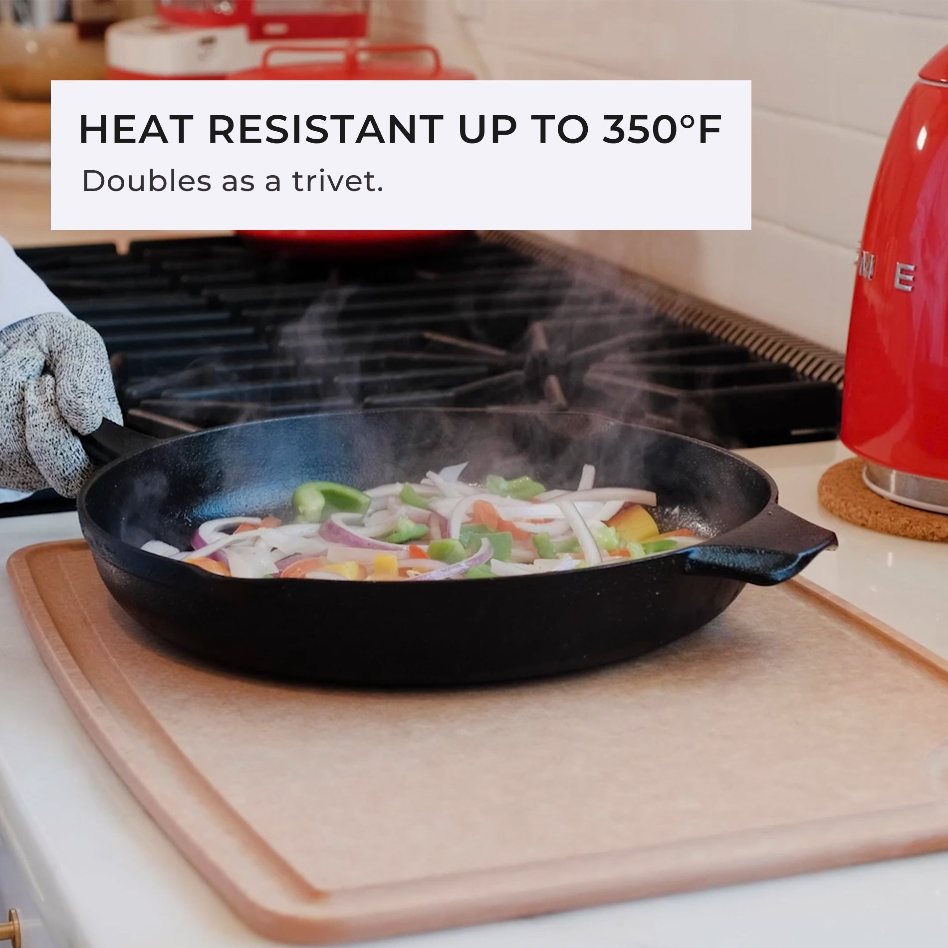 Made in the USA from high-density pine leaf sustainable material, this fiberwood 10"x 13"x 1/4” inch (24 x 33 x 0.63cm) cutting board is perfect for daily meal preparation; No matter veggies or meat, the reversible design allows you simply flip the board over and explore your endless options with both sides for different food types. - Knife friendly, resist deep cut marks and protects knives. Nonporous, do not absorb odor or harbor bacteria. - Featured deep groove design catch flour, liquids, sticky or acidic drippings from spilling over the counter. - Solid durable fiber wood material resists warping and not easy to crack, durable for daily use. Built-in thumb hole for easy grip & move around in busy kitchen and storage. - Heat resistant up to 350°F, and can be used as a trivet. Maintenance-free, easy-clean, and 100% dishwasher safe. - Made from high-density leaf pine material, made by high temperature and high pressure, safe and healthy for your everyday meal preparation, NSF certified. - Limited lifetime warranty. 2-piece set includes: M size: 10" x 13" x 1/4” – Perfect for daily food preparation (Natural Color) M size: 10" x 13" x 1/4” – Perfect for daily food preparation (Black Color)