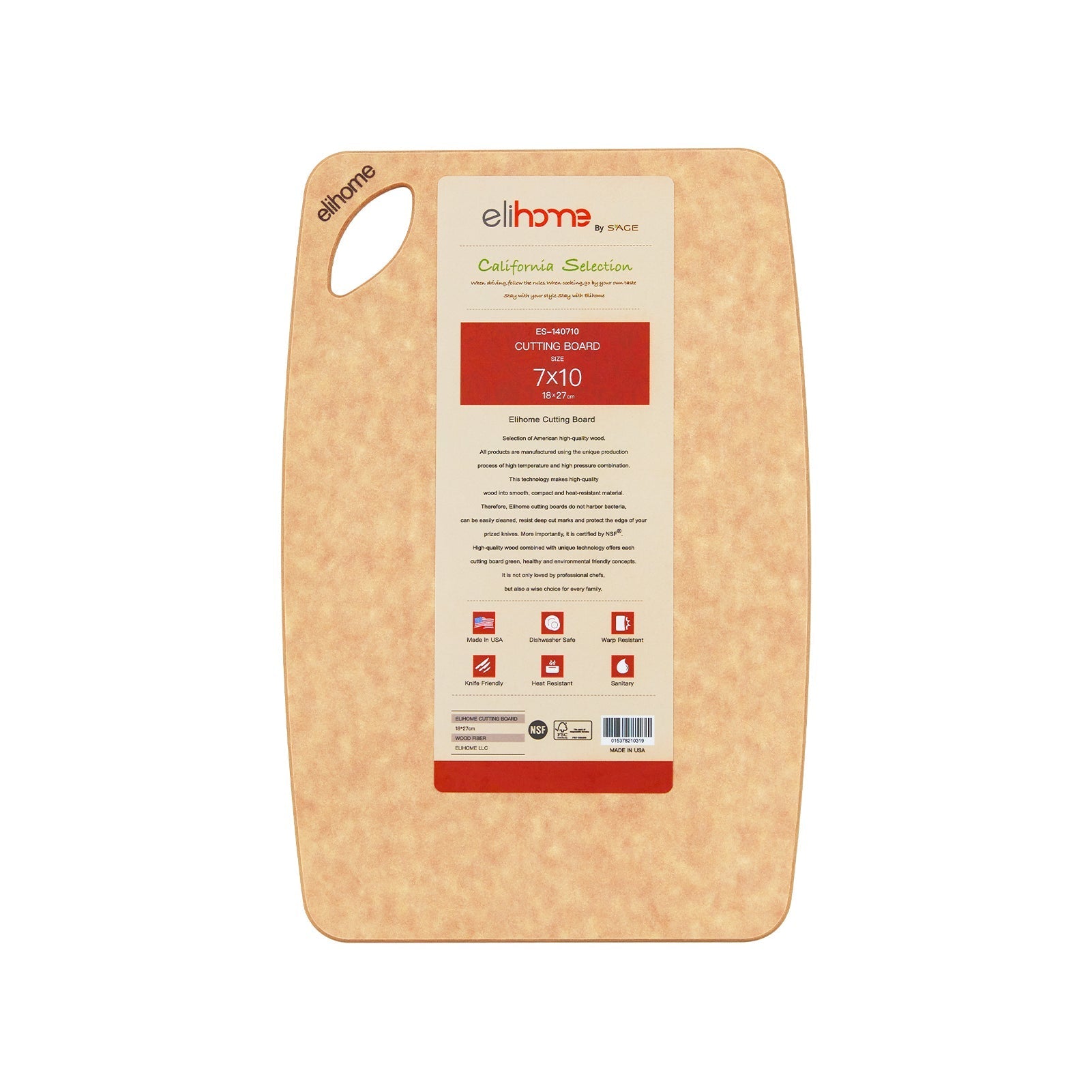 - Made in the USA from high-density pine leaf material, this 7"x 10"x 1/4" (18 x 27 x 0.65 cm) cutting board is perfect for slicing, cutting, and serving, especially ideal for fruits, nuts, and cheese serving. - The reversible design allows you simply flip the board over and explore your endless options with both sides for different food types. - Knife friendly, resist deep cut marks, and protects knives. Nonporous, do not absorb odor or harbor bacteria. - Solid durable fiberwood material resists warping and is not easy to crack, durable for daily use. - Built-in thumb hole for easy grip & move around in busy kitchen and storage. - Heat resistant up to 350°F, and can be used as a trivet. Maintenance-free, easy-clean, and 100% dishwasher-safe. - Made from high-density pine leaf material, made by high temperature and high pressure, safe and healthy for your everyday meal preparation. NSF certified. - Perfect for slicing, cutting, and serving, the options are endless. - Limited lifetime warranty.