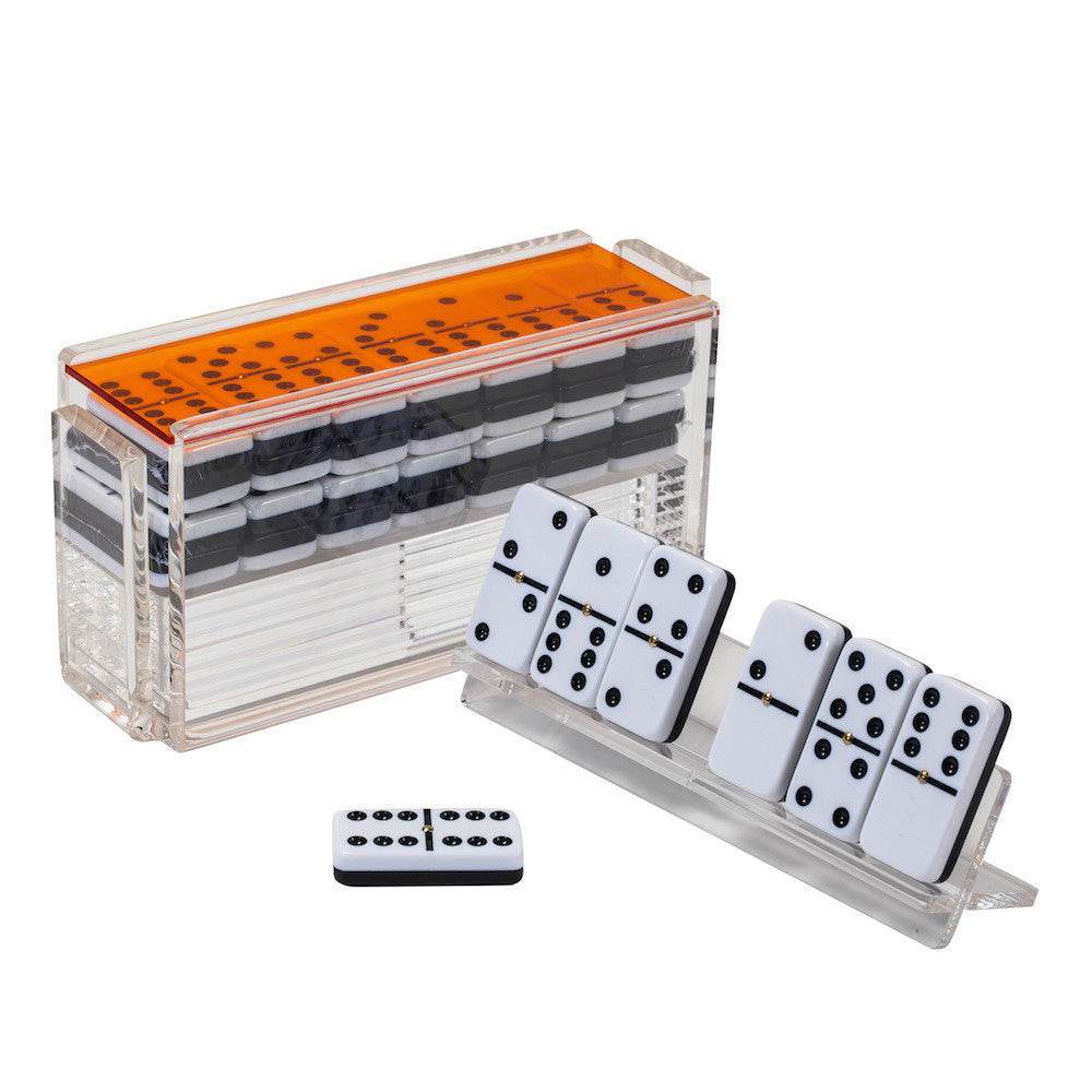 "El Catire" is a modern domino set with 4 racks. The Orange lid version is a transparent orange that captures the light and gives the box an elegant look.