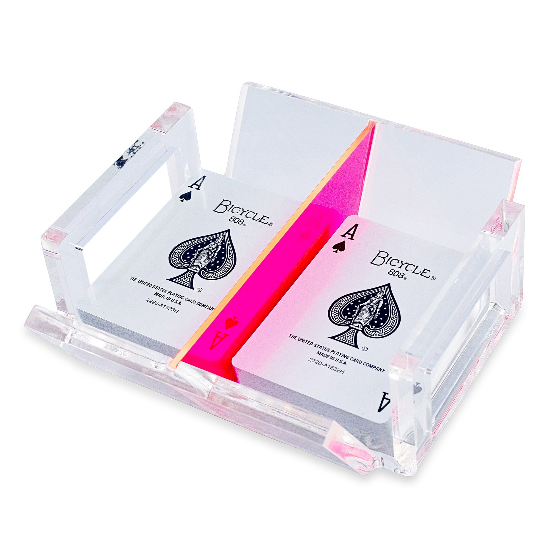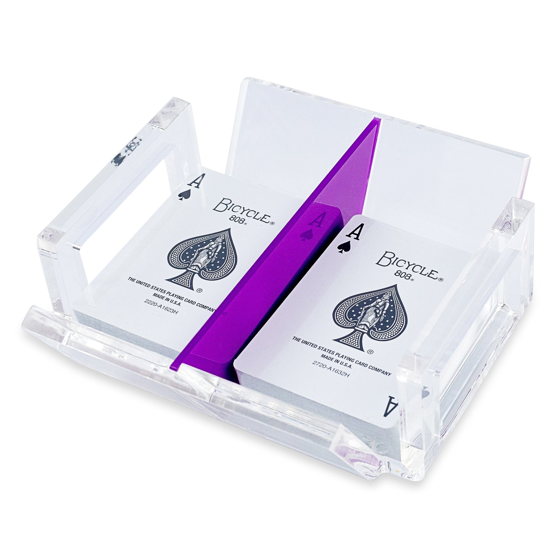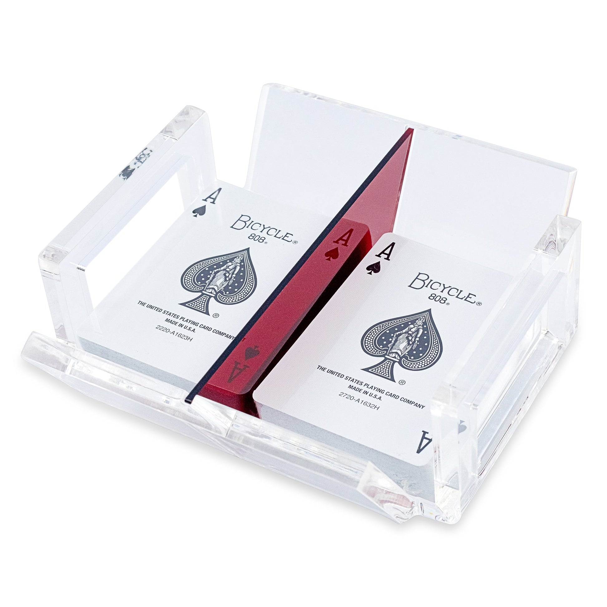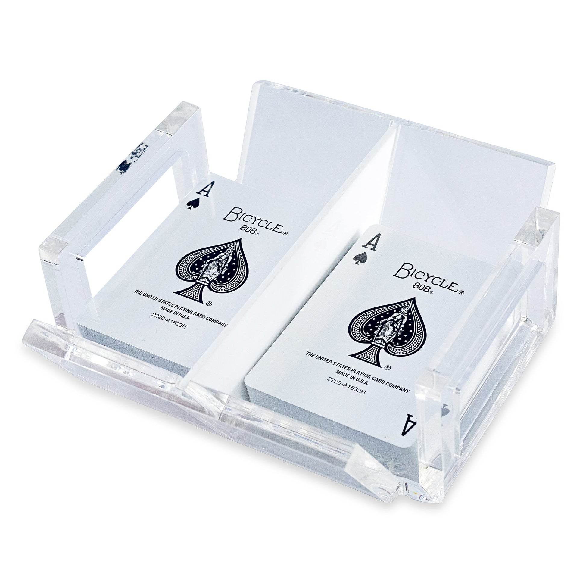 This open canasta tray has 2 sides to pull from, an opening for turn cards and a spinner. Great for play with 2 or 3 decks at a time. It comes with 2 decks of playing cards.