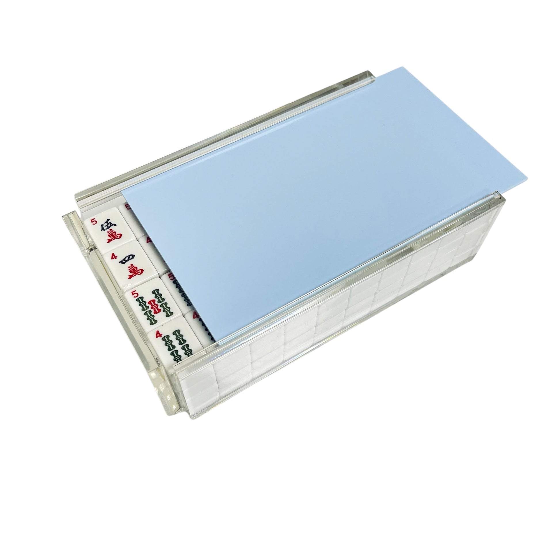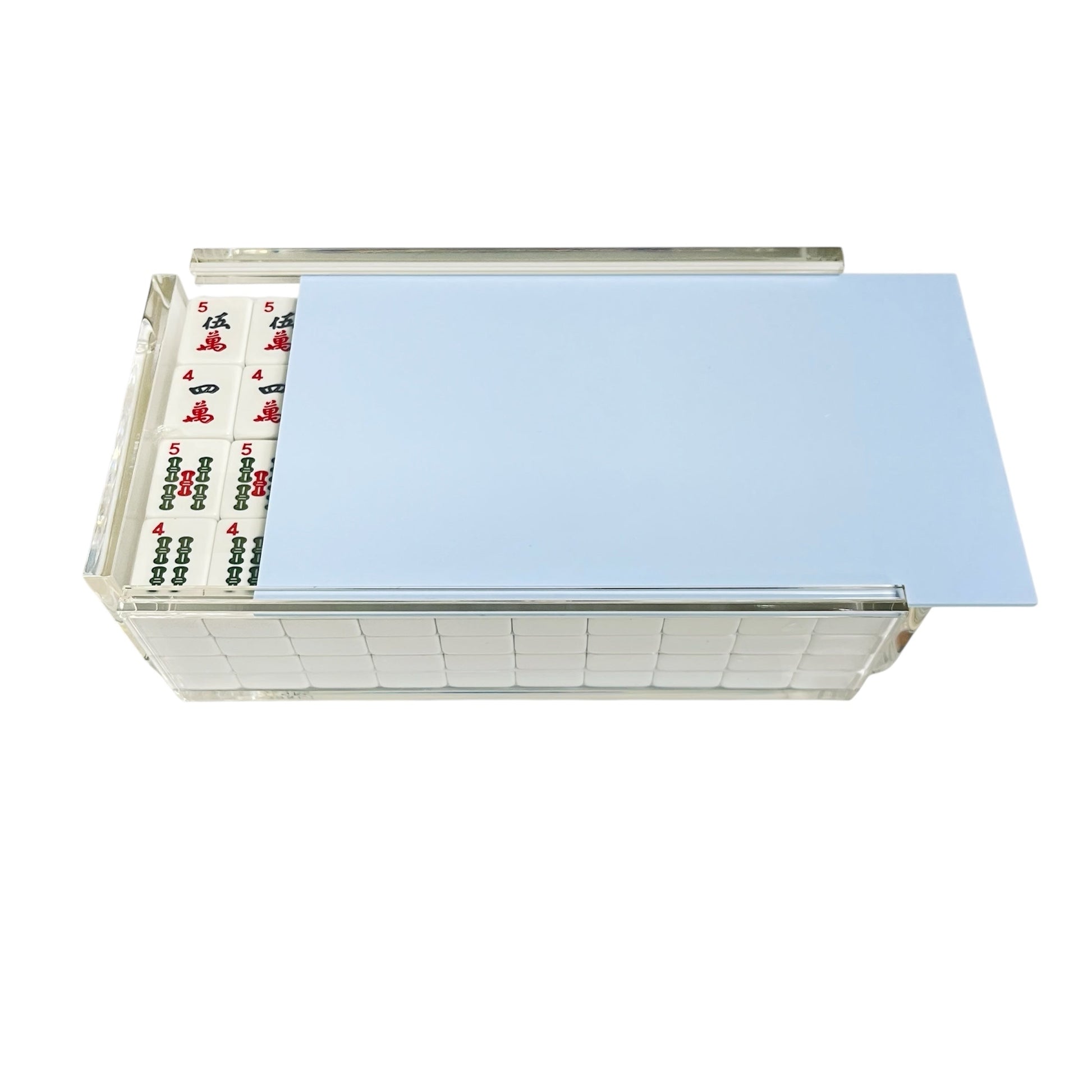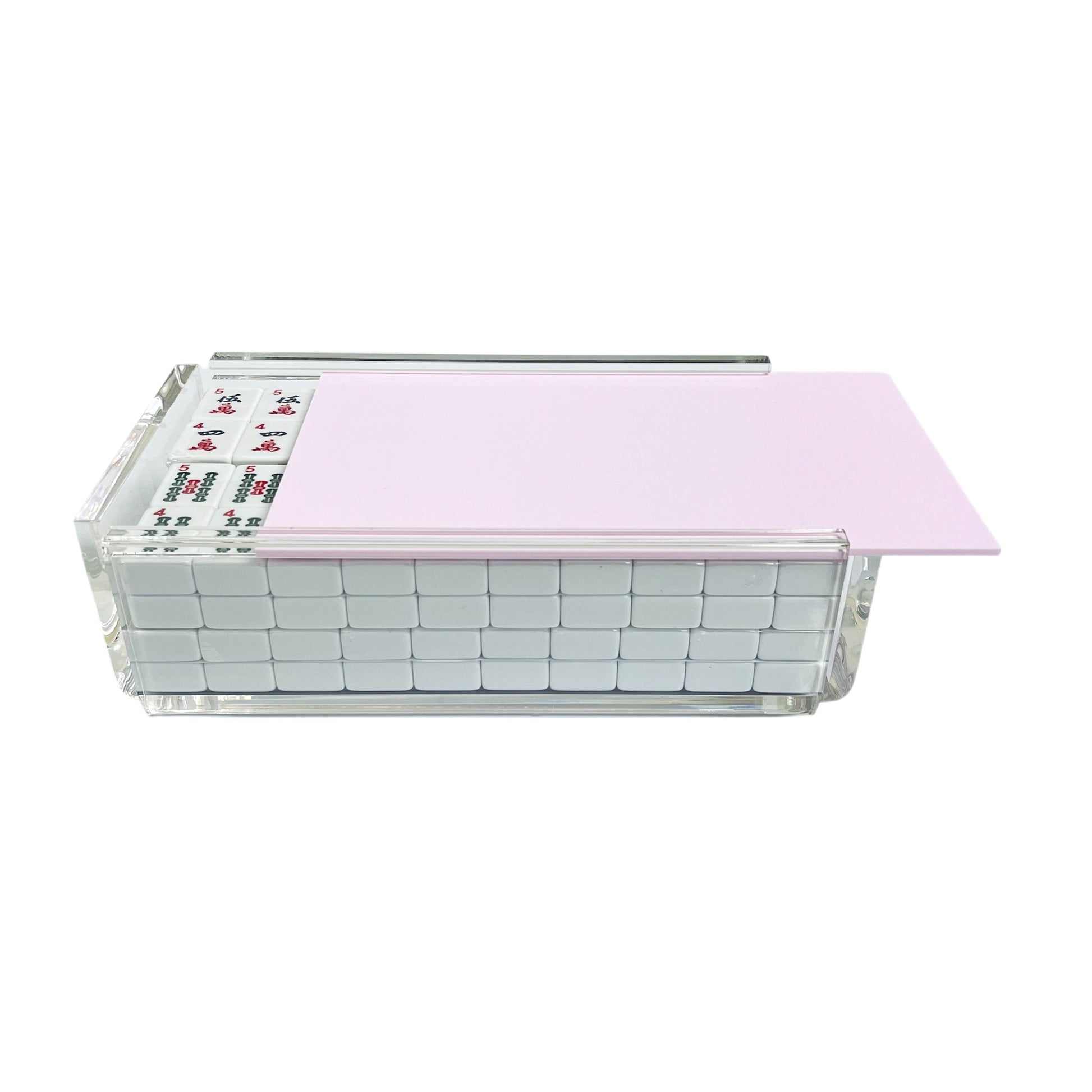 Our Luxe Mahjong Set with Pastel Color Lids come with tiles, how to play booklet, 4 extra blank tiles, 2 extra joker tiles and point markers. Each acrylic box is handmade by craftsmen here in Miami. It also comes with 4 racks. You can choose from all Clear racks or a Multi-Color racks set. They come standard with American Mahjong All White tiles.