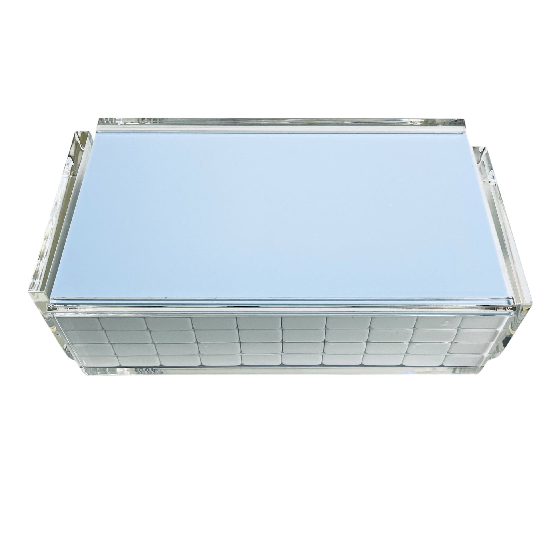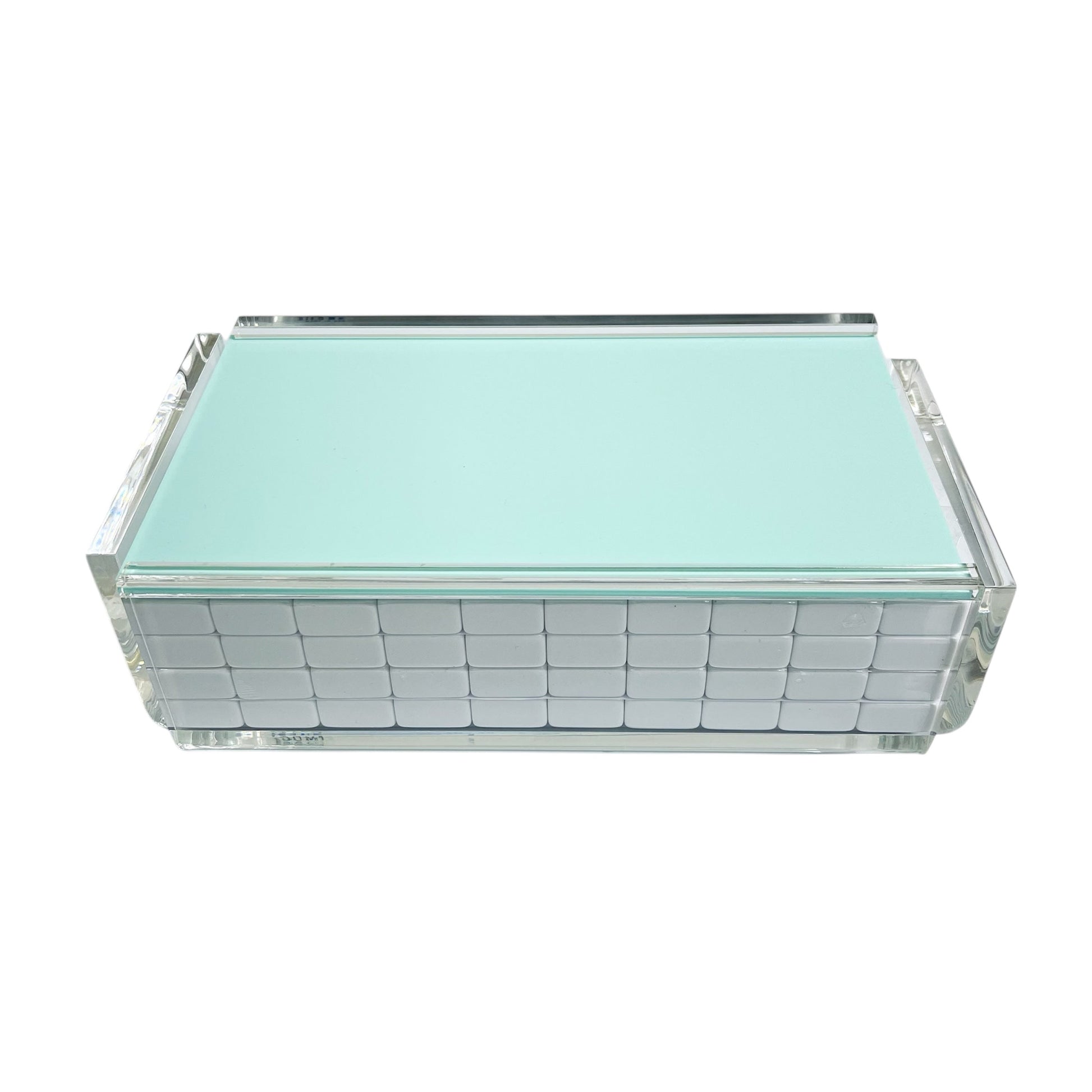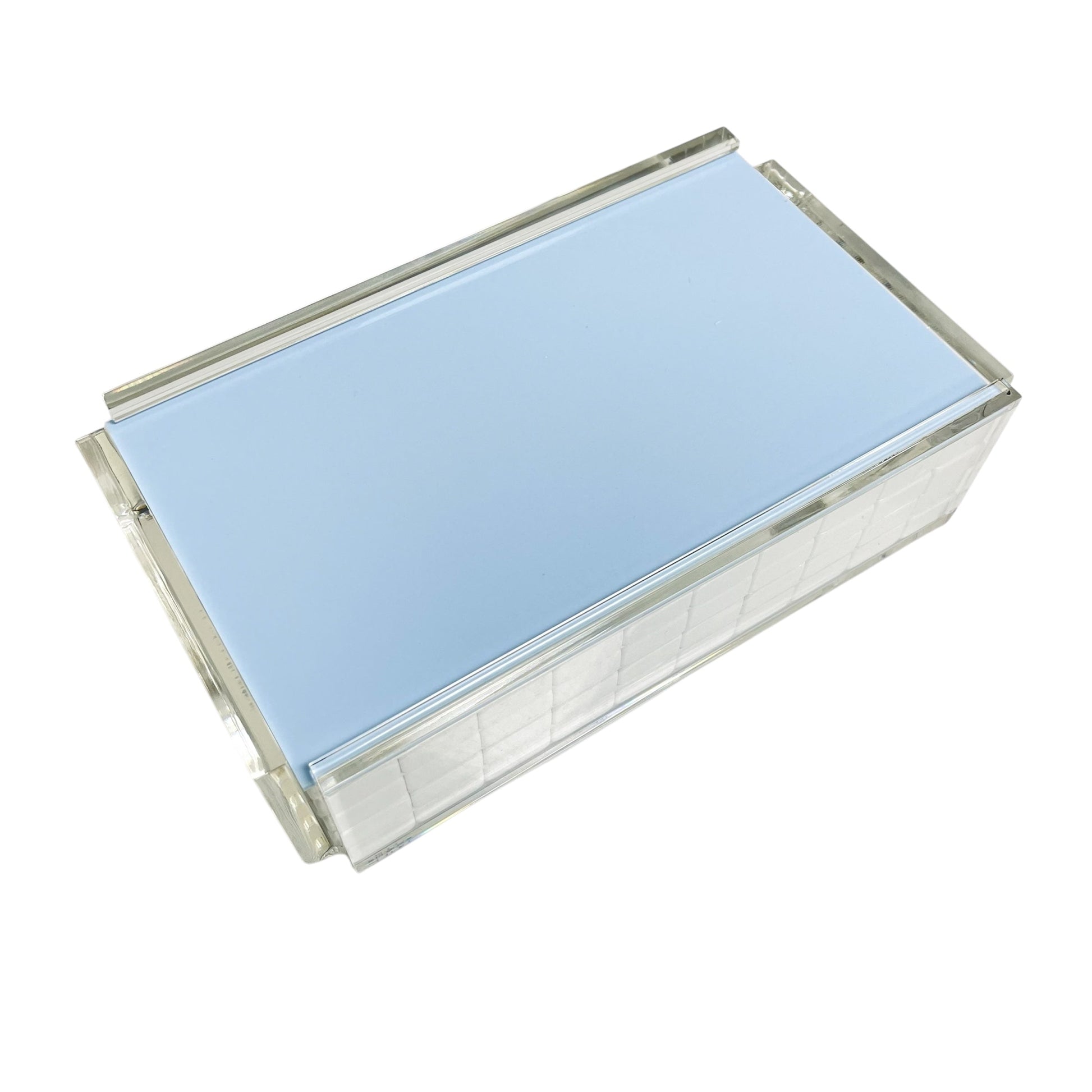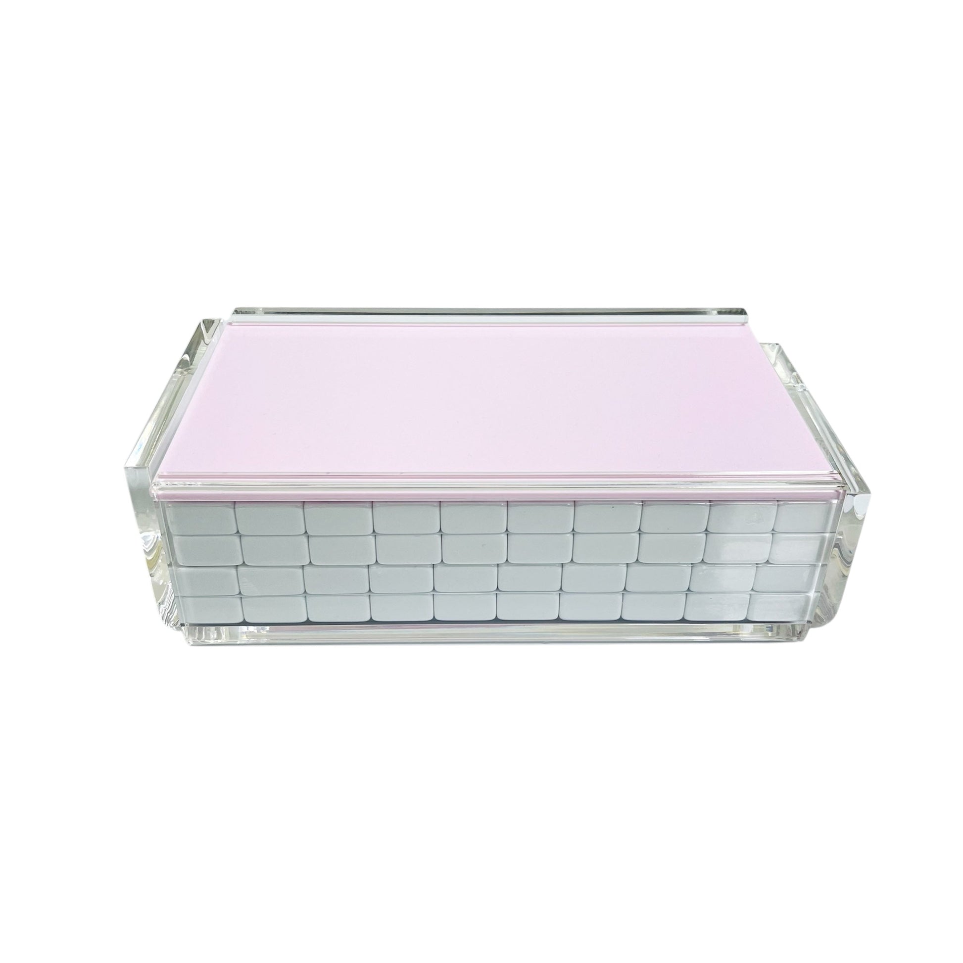 Our Luxe Mahjong Set with Pastel Color Lids come with tiles, how to play booklet, 4 extra blank tiles, 2 extra joker tiles and point markers. Each acrylic box is handmade by craftsmen here in Miami. It also comes with 4 racks. You can choose from all Clear racks or a Multi-Color racks set. They come standard with American Mahjong All White tiles.