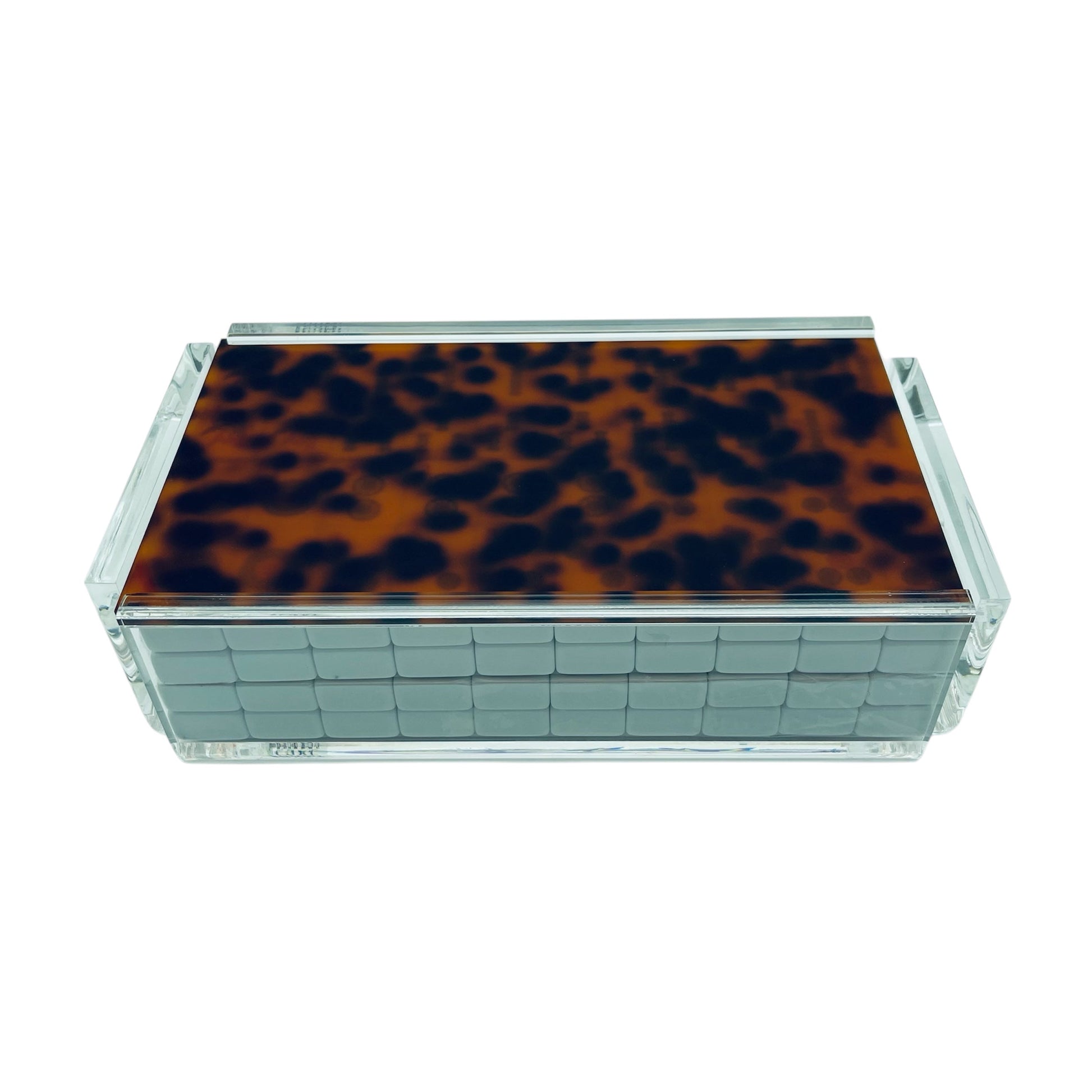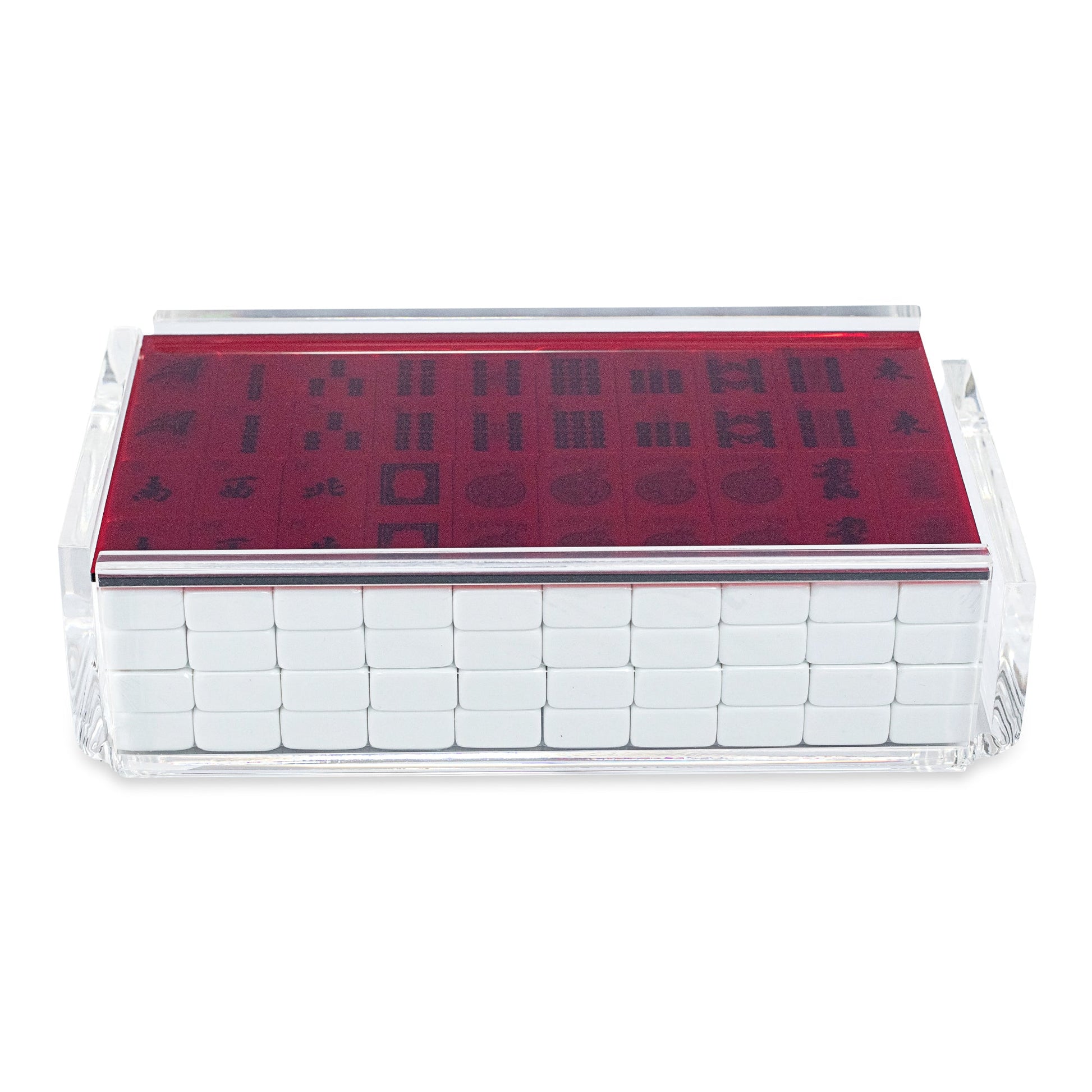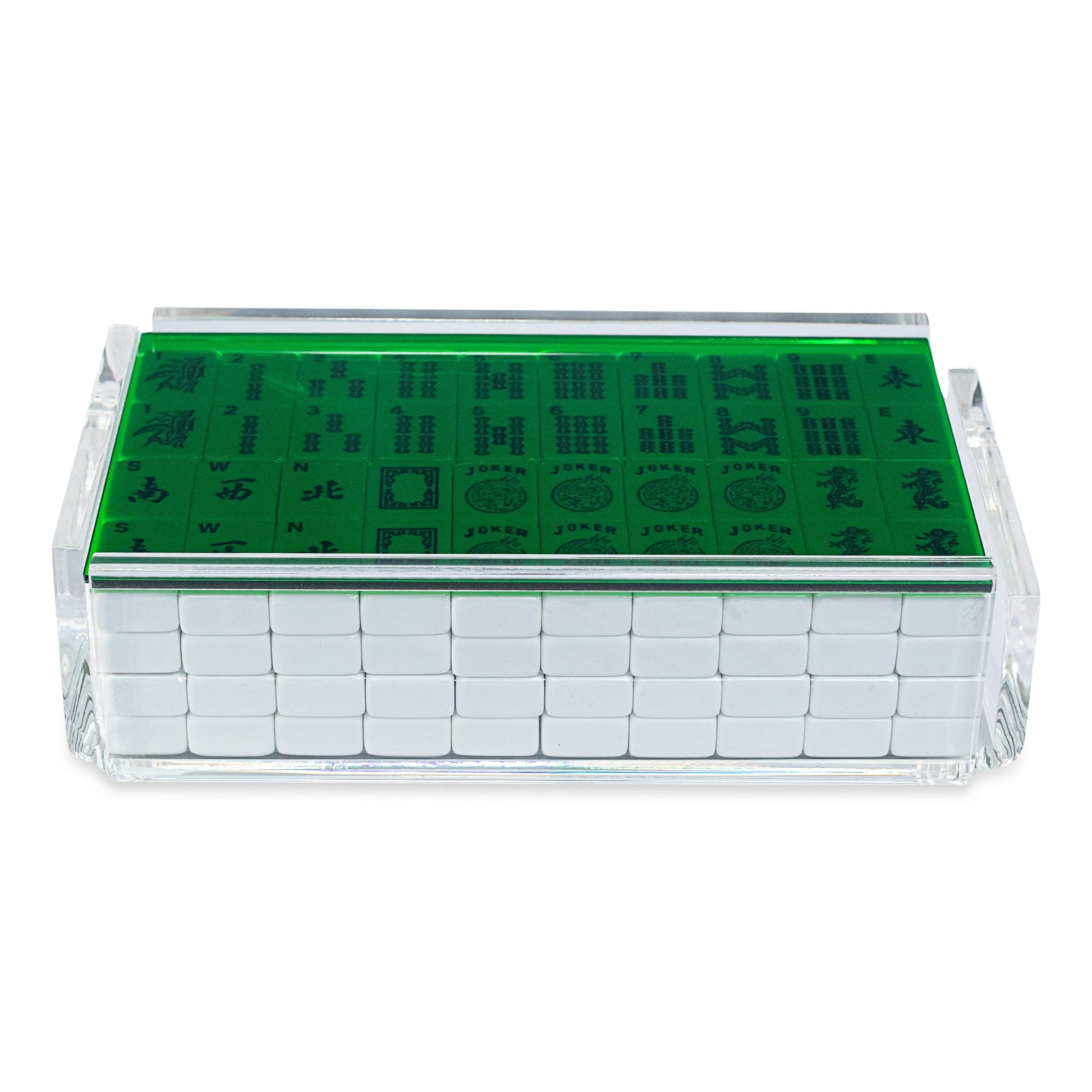 Our Luxe Mahjong Set comes with tiles, how to play booklet, 4 extra blank tiles, 2 extra joker tiles and point markers. Each acrylic box is handmade by craftsmen here in Miami. It also comes with 4 racks. You can choose from all clear racks or a Multi-Color racks set. They come standard with All White tiles but we have White/Blue, White/Red (burgundy) and White/Green tiles as well.