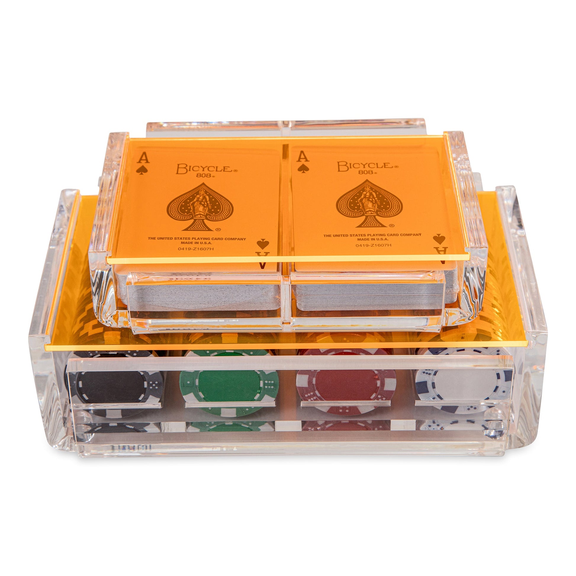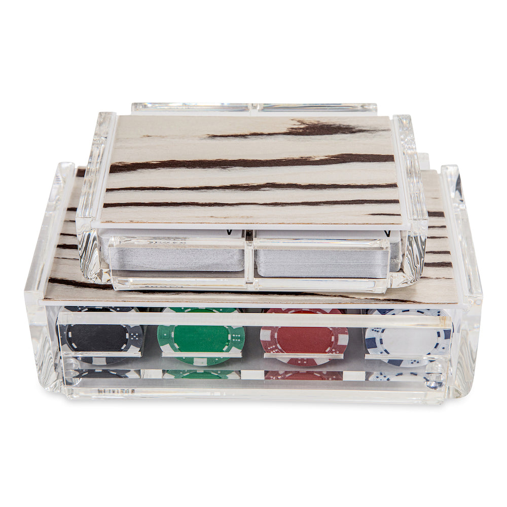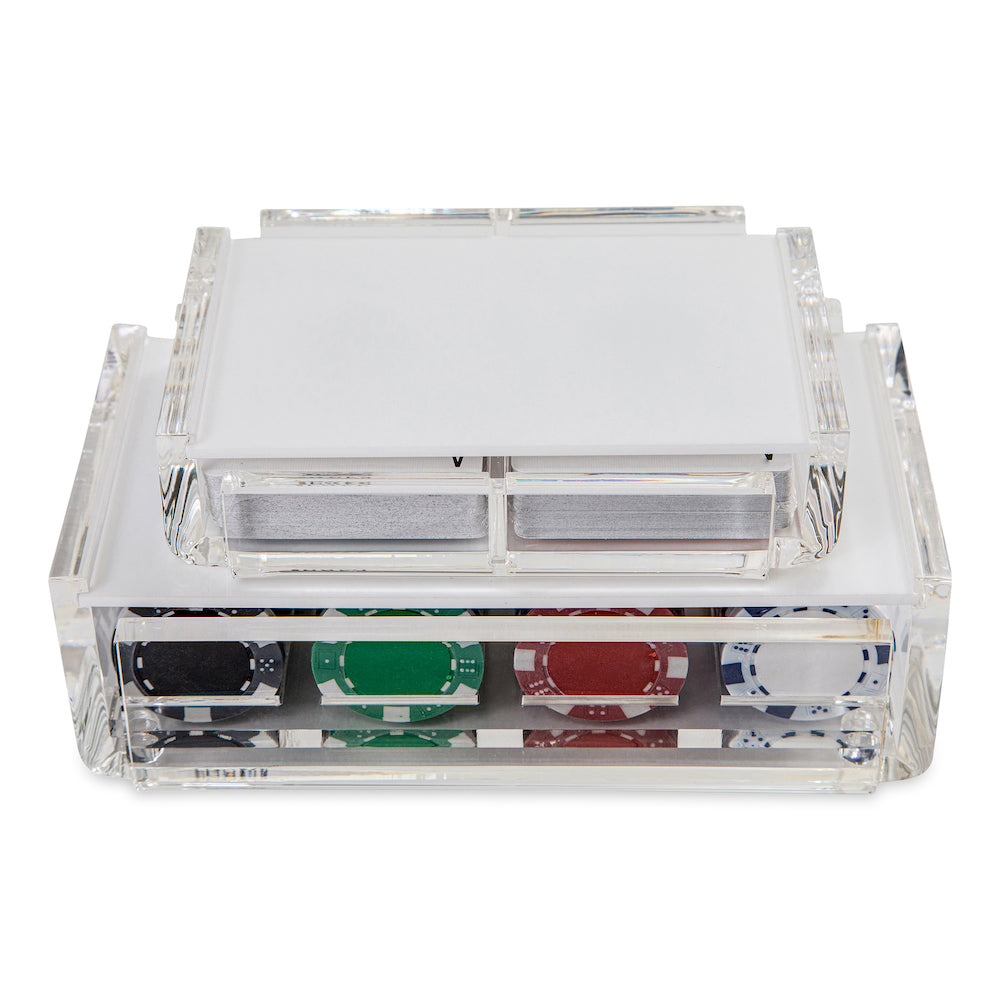 Our luxury poker set comes with 100 poker chips and 2 Decks of Poker Cards. All chips are casino grade and have a good weight to them. 25 Black, 25 Green, 25 Red and 25 White. They are set in a clear acrylic box that is handmade by craftsmen here in Miami. The card decks have blue and red backs. The lid provides the touch of color.