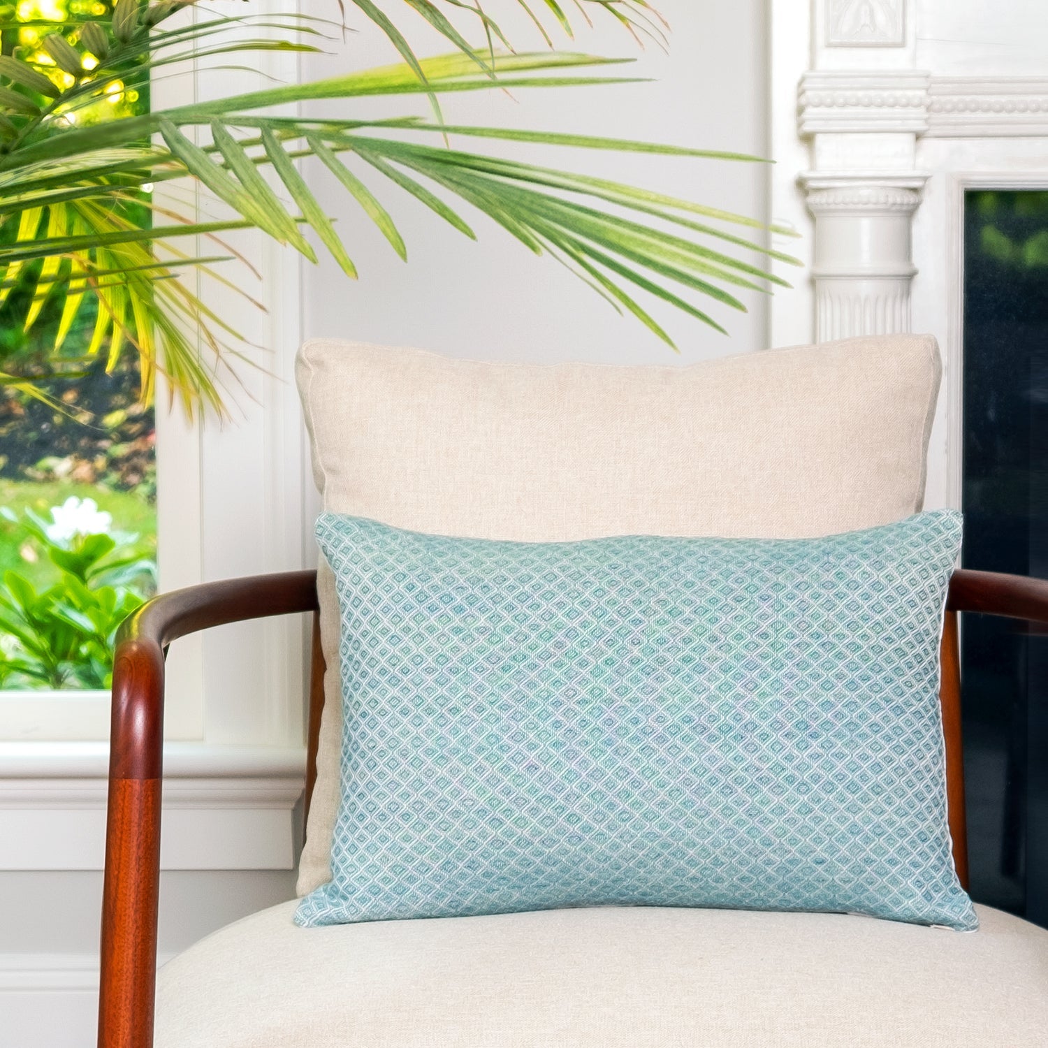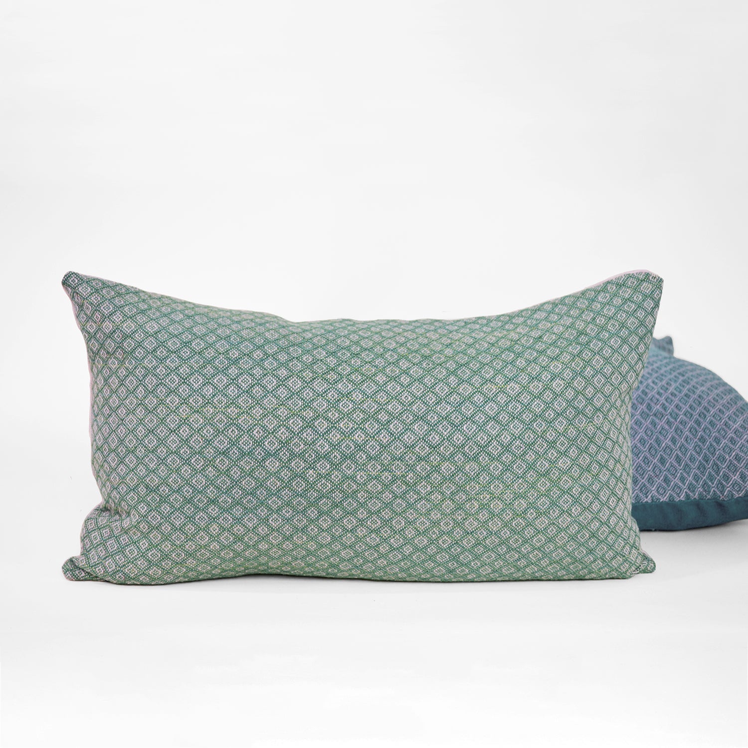 The green Diamond Lumbar Pillow showcases true crafts(wo)manship with a 100% handwoven cotton front, linen backing, and invisible zipper closure.