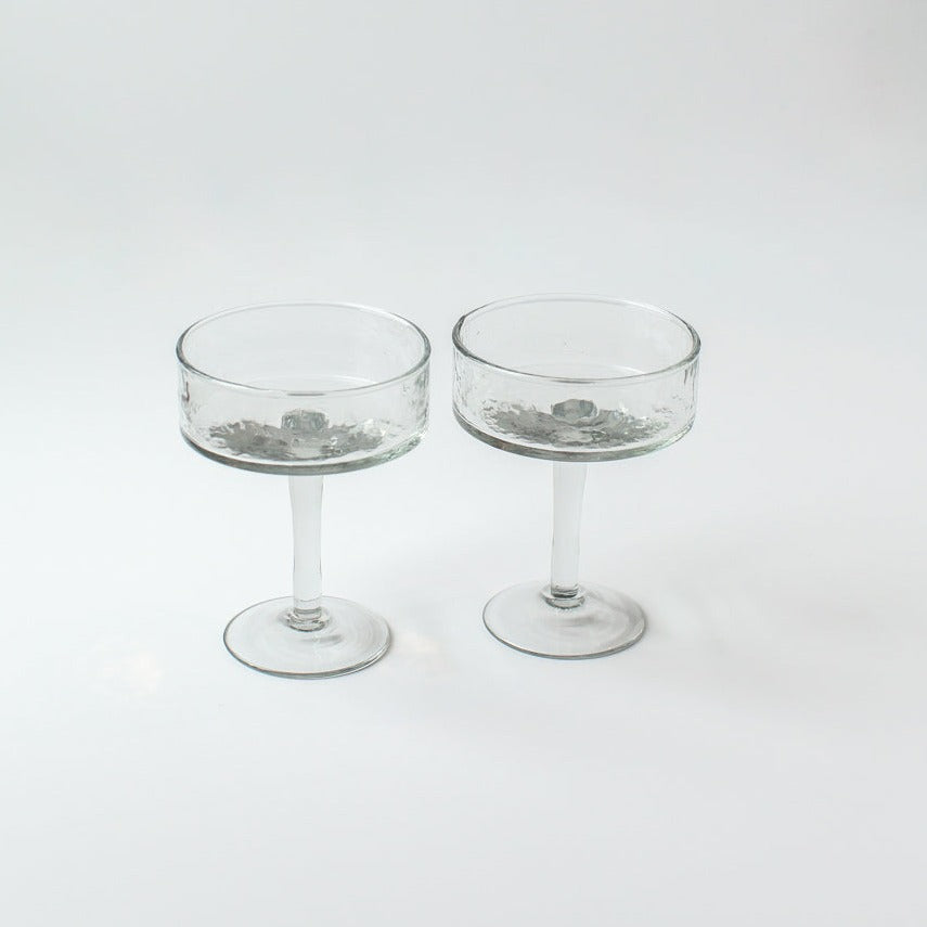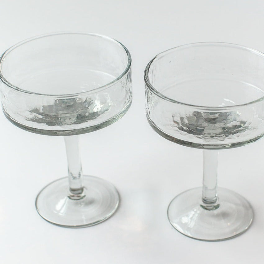 Handblown with a stunning hammered finish, these coupe glasses take your cocktails and mocktails to the next level. Crafted with care at a women-owned business, each is ethically made from 100% recycled glass.