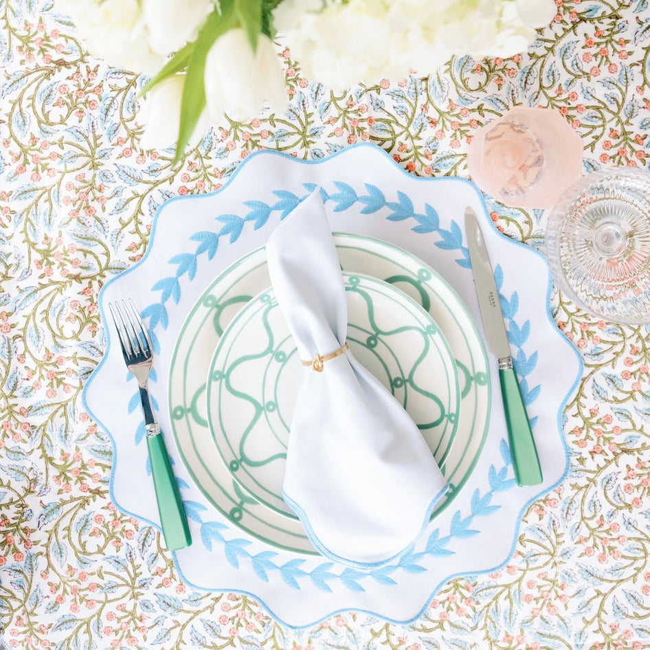 A special set of scalloped placemats with an embroidered ivy edge in blue.