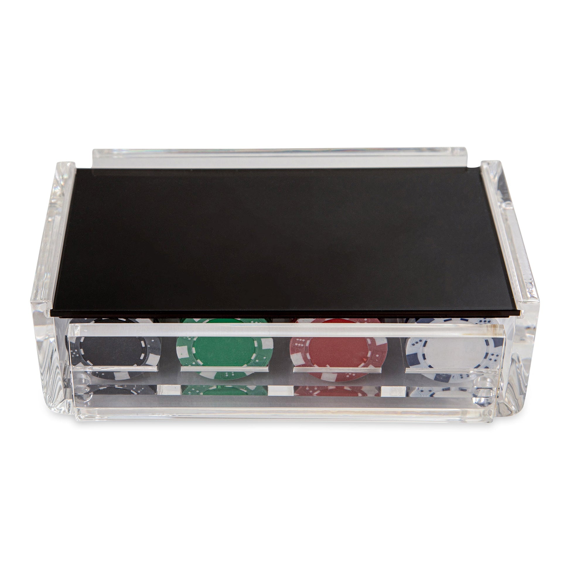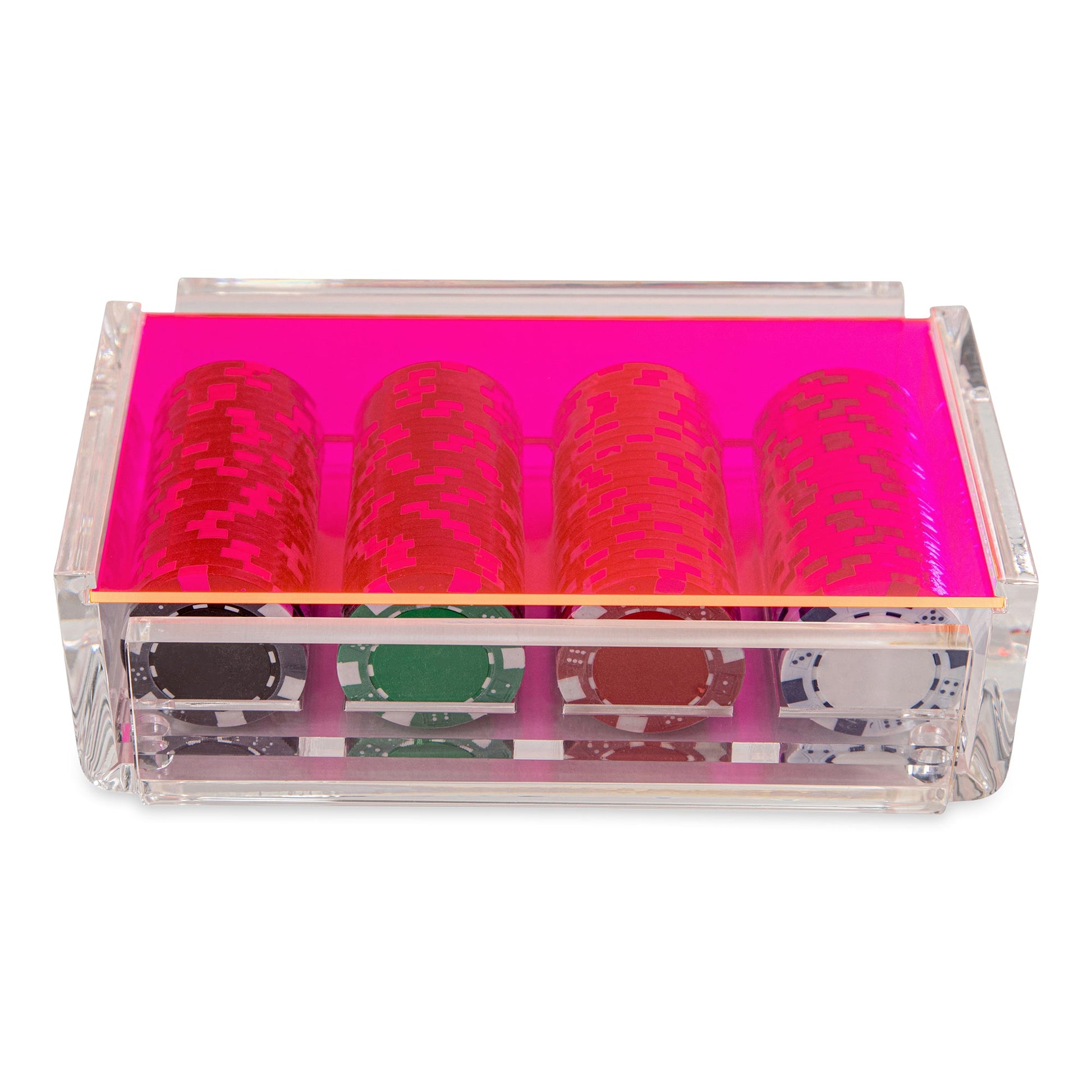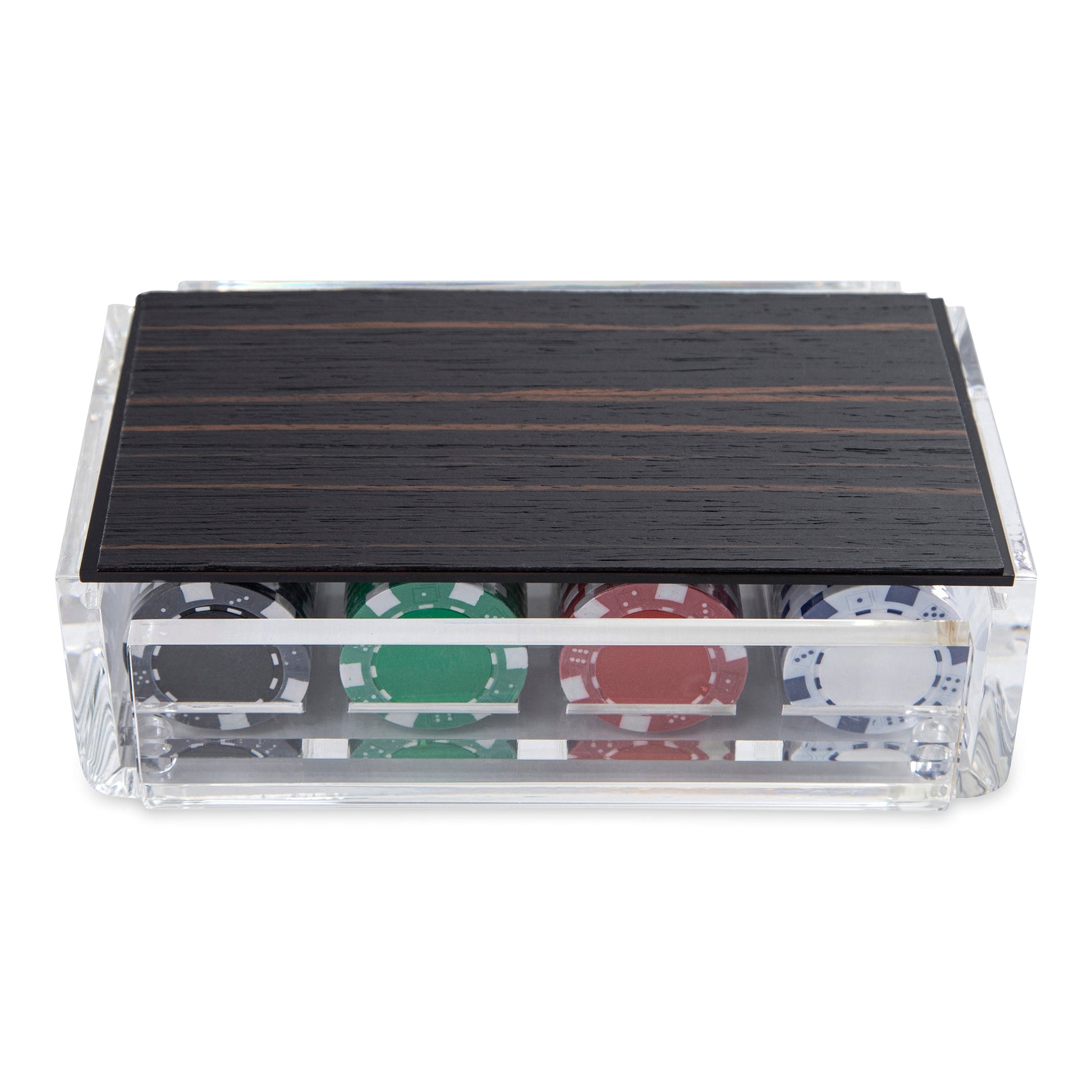 Our luxury poker chip set comes with 100 poker chips. All chips are casino grade and have a good weight to them. 25 Black, 25 Green, 25 Red and 25 White. They are set in a clear acrylic box that is handmade by craftsmen here in Miami. The lid provides the touch of color.