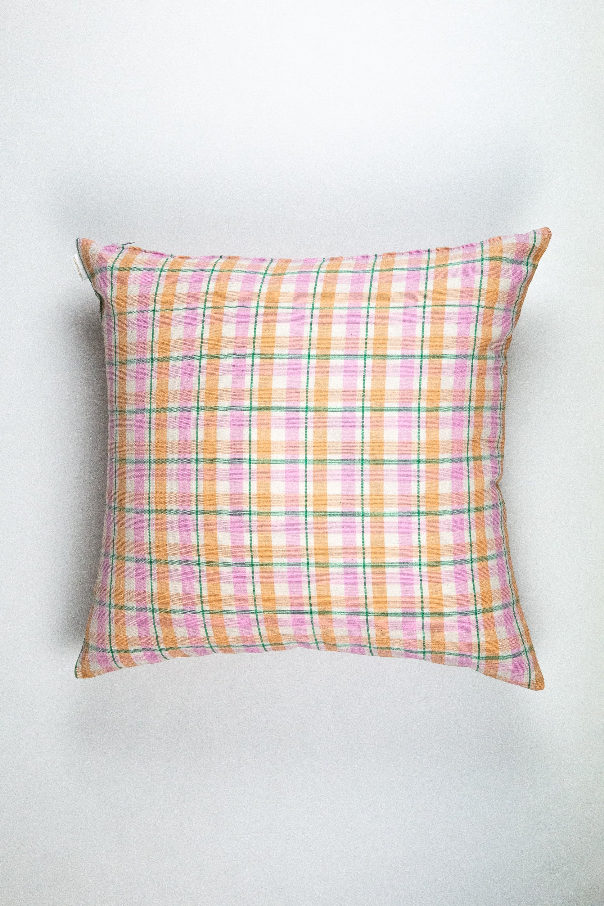 The Marguerite ruffle plaid pillow is the perfect accent to add soft color and texture to any sofa, bedroom or accent chair. Stripes of bubblegum, peach, and kelly green are woven together to create this brilliantly colorful piece. Ethically handwoven by artisans in Xela, Guatemala.