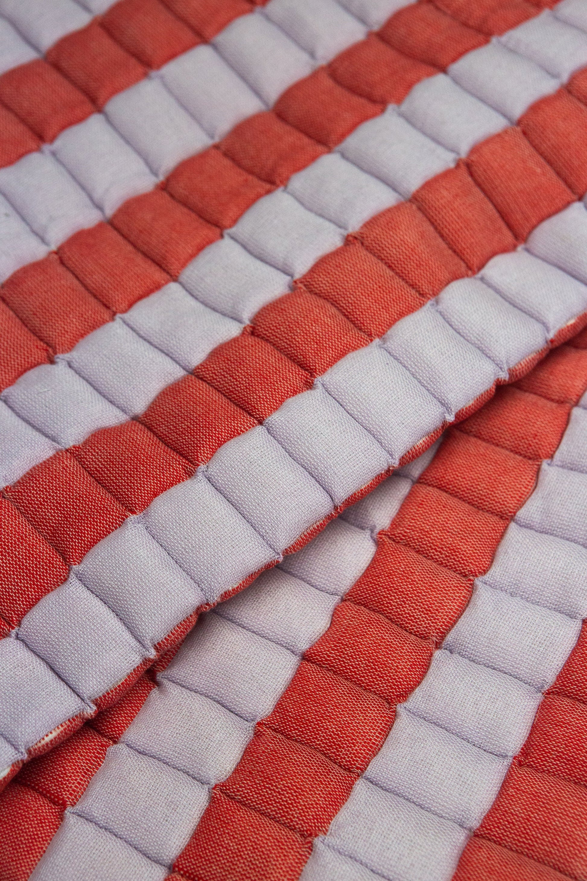 Each square is hand stuffed with cotton batting as its woven. The size is perfect for a sofa or chair throw blanket. Please inquire if you'd like a larger size. Poly-cotton blend.