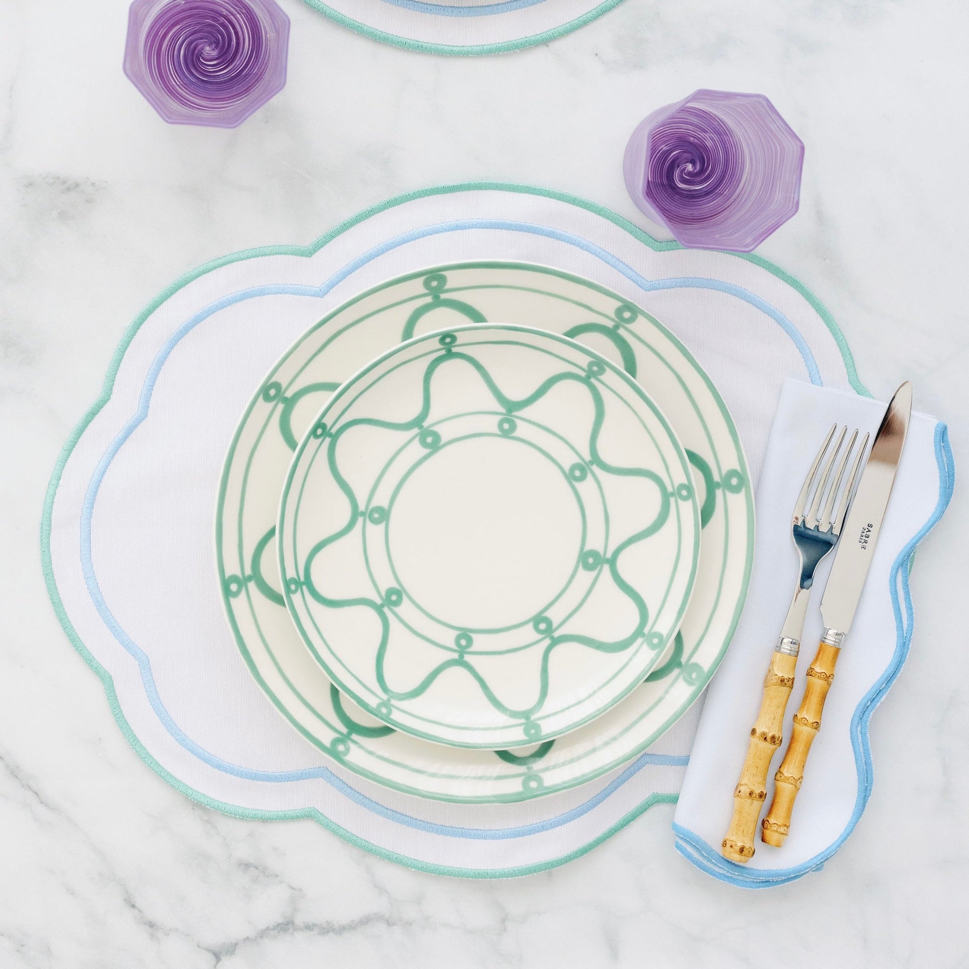 The Remi placemats are designed in an elegant white and embroidered with a pretty double seafoam and blue border.