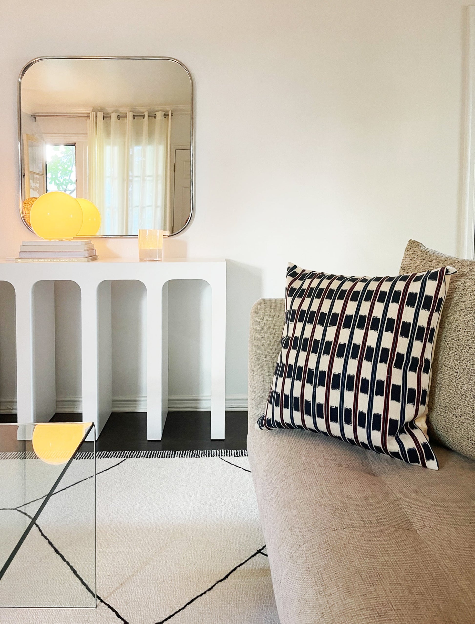 This textile was woven by an artisan from the lakeside village of Santiago Atitlan, Guatemala, using a time honored traditional method of weaving called the back-strap loom. This pillow features an intricate Guatemalan tie dye technique jaspé. This particular jaspé design is specific to Santiago Atitlan. This pillow was made in partnership with a non-profit organization on Lake Atitlan, Guatemala.