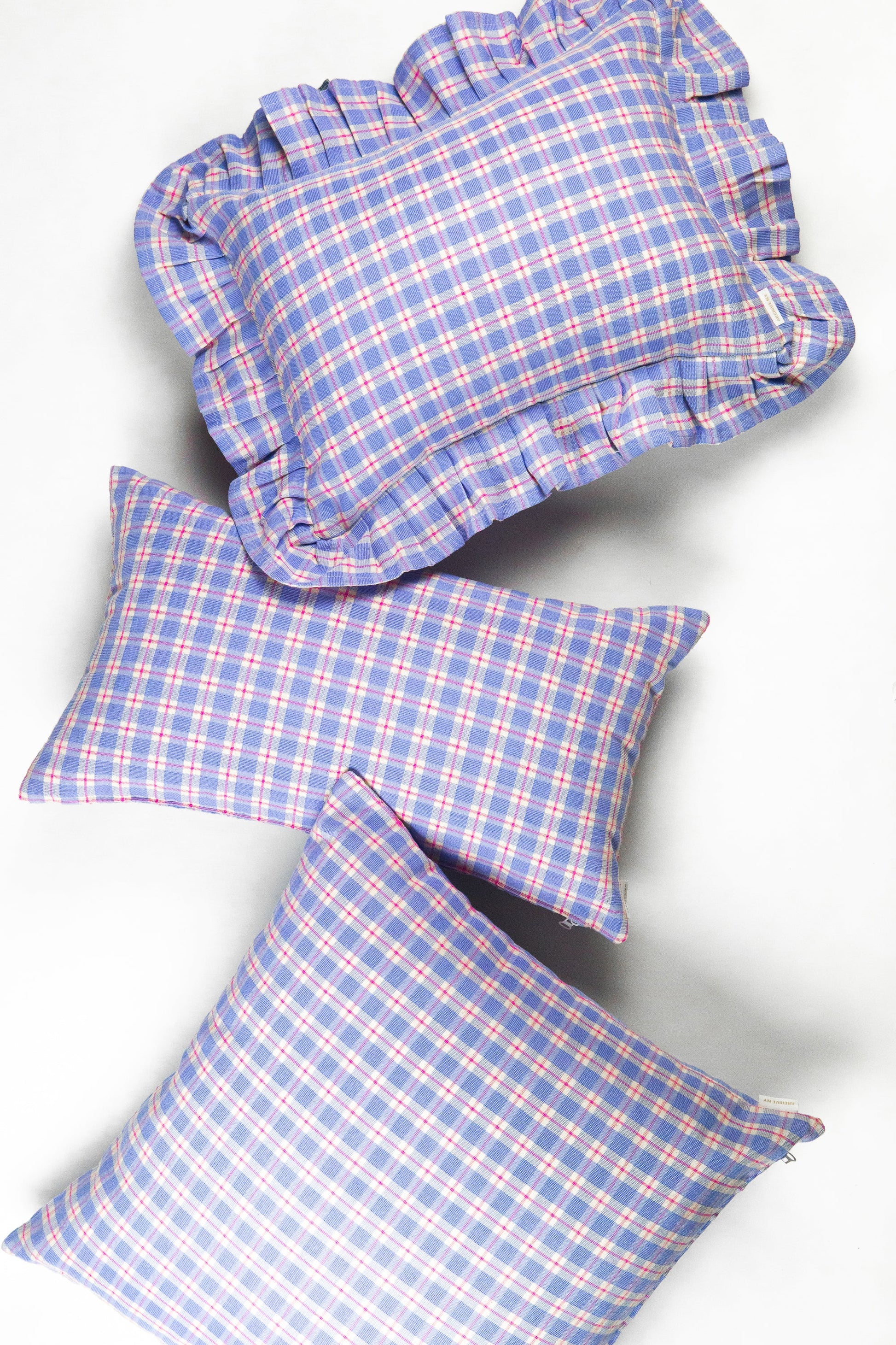 The Sofia plaid pillow is the perfect accent to add soft color and texture to any sofa, bedroom or accent chair. Stripes of periwinkle and pink are woven together to create this brilliantly colorful piece. Ethically handwoven by artisans in Xela, Guatemala.