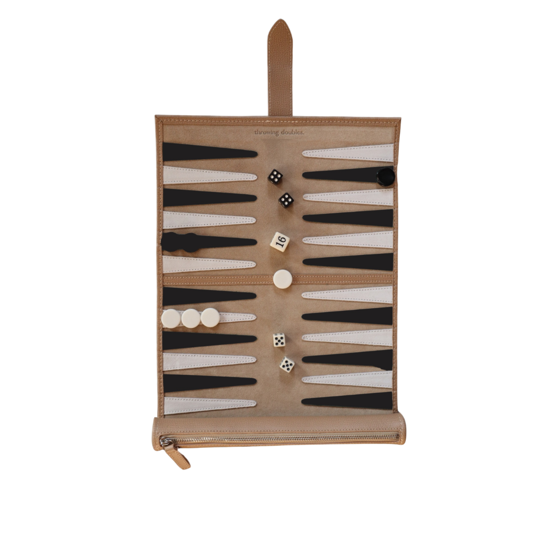 Handmade in Los Angeles, this luxe tan and black travel backgammon set is a perfect addition to any globetrotter’s hand luggage. The set features a leather base with a brown, white and black suede playing field. Ideal for the traveller who can’t resist a game on the go.
