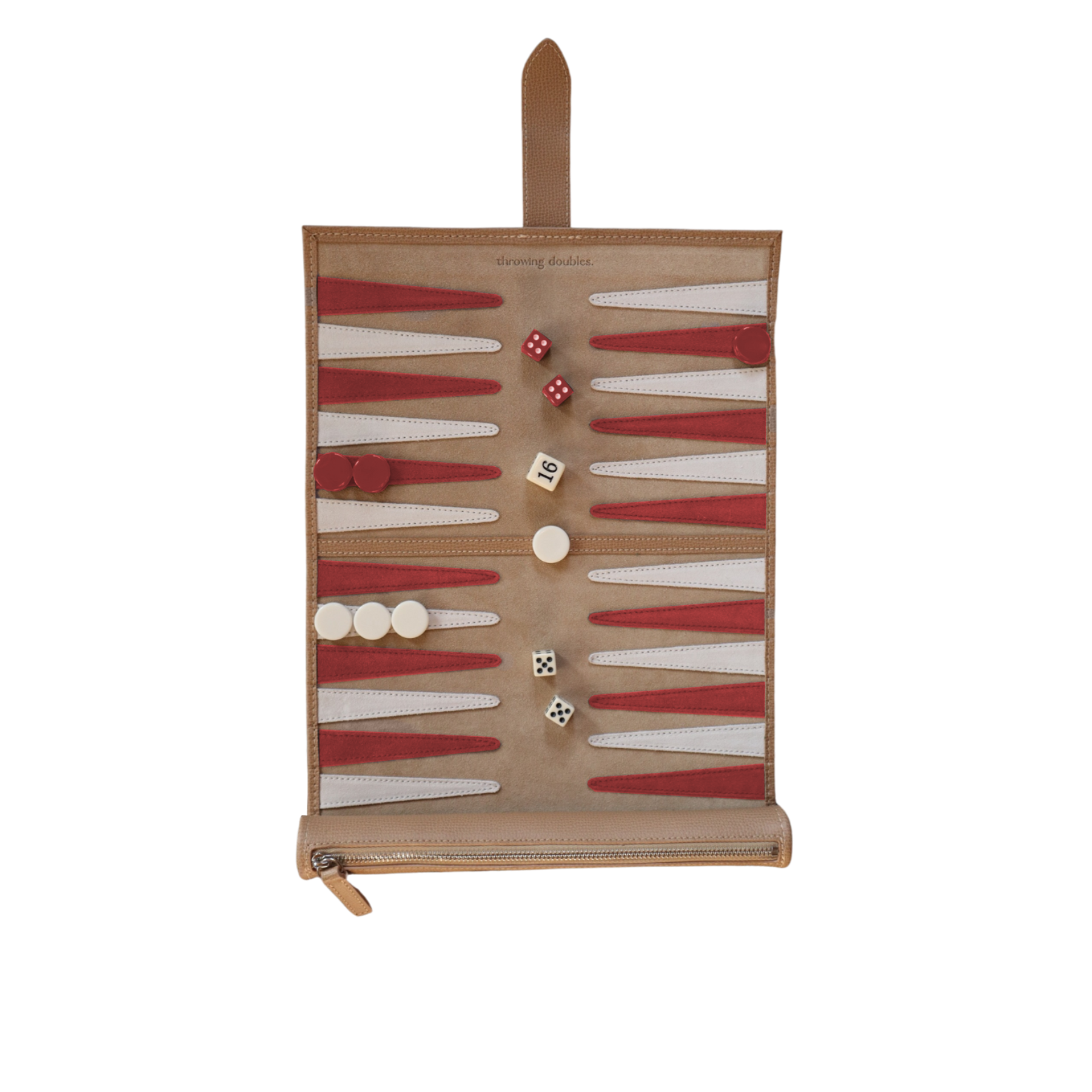 Handmade in Los Angeles, this luxe caramel travel backgammon set is a perfect addition to any globetrotter’s hand luggage. The set features a leather base with a tan, white and red suede playing field. Ideal for the traveller who can’t resist a game on the go.