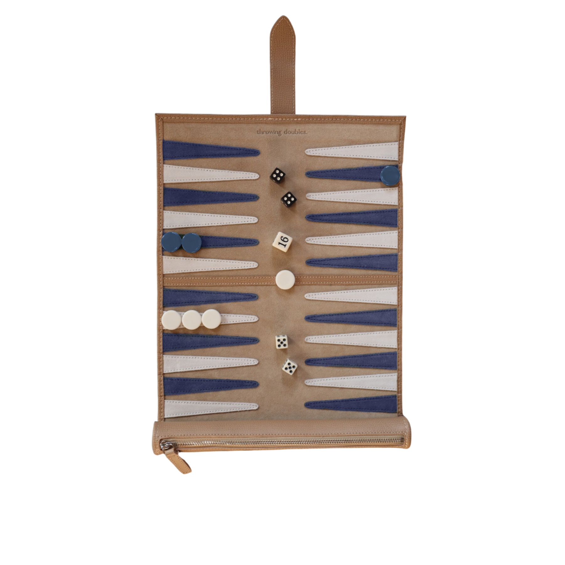 Handmade in Los Angeles, this luxe caramel travel backgammon set is a perfect addition to any globetrotter’s hand luggage. The set features a leather base with a tan, white and navy suede playing field. Ideal for the traveller who can’t resist a game on the go.