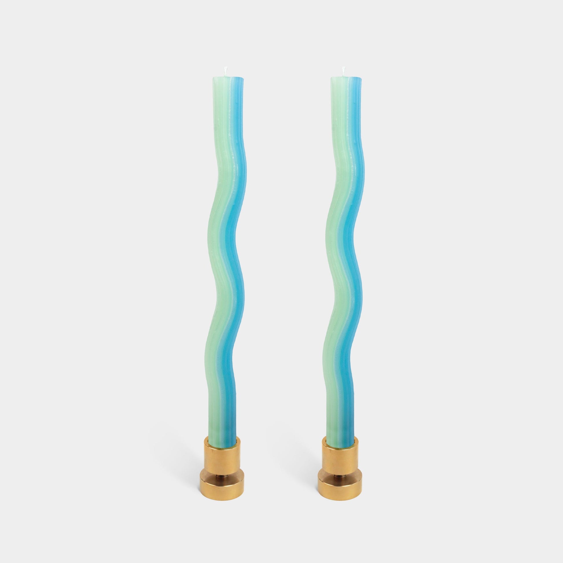 Wiggle Candles combine a functional dining candle with fun, joy and experiment. Bright color combinations are squeezed together in an undulating shape to create a sense of motion. Wiggle Candles fit in any standard size candleholder. Candleholder not included.